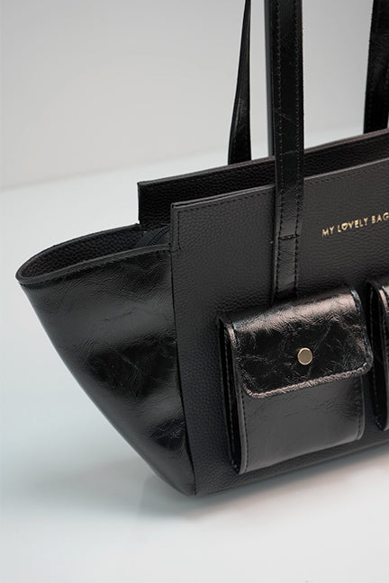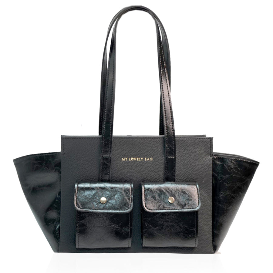 Torba većih dimenzija s “one size” ručkama, izrađena od kombinacije dviju tekstura umjetne kože s ukrasnim džepovima na licu torbe.