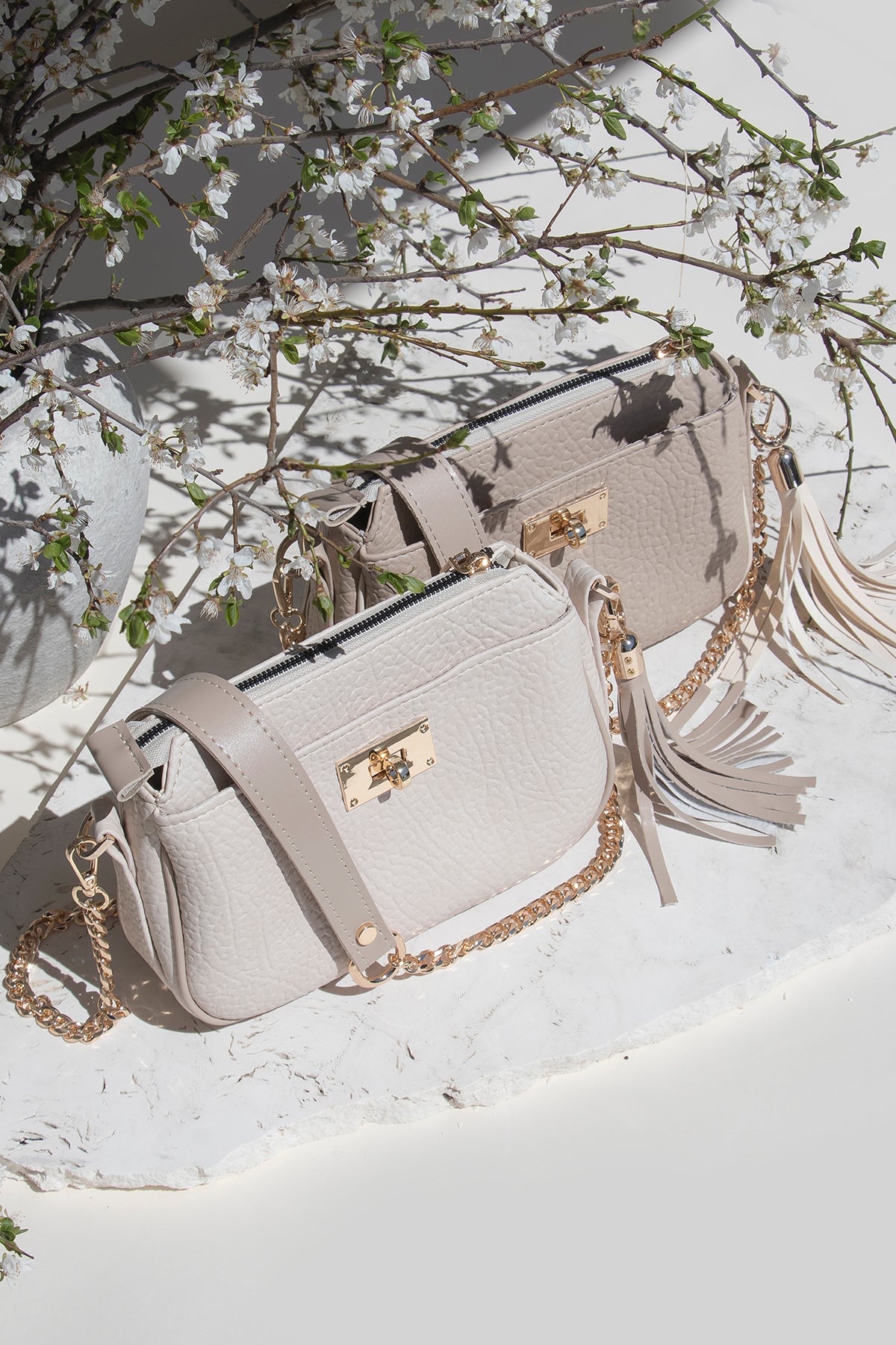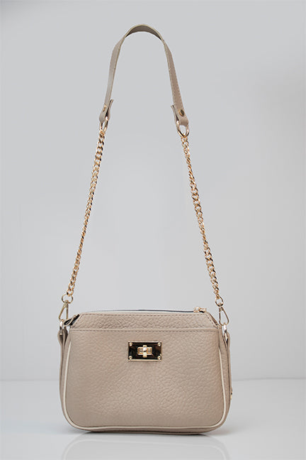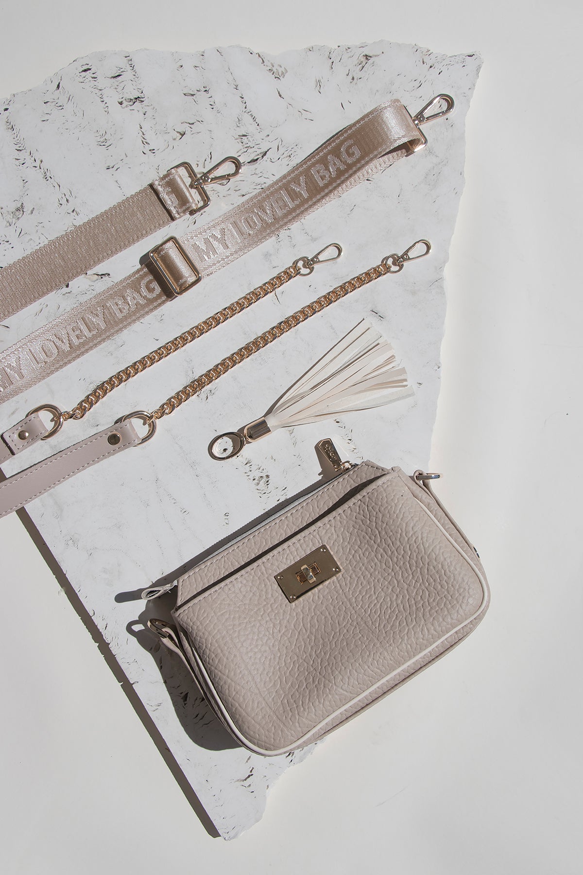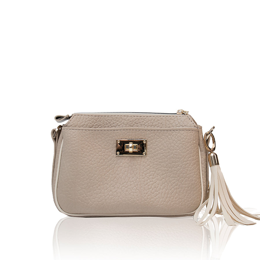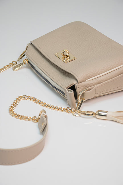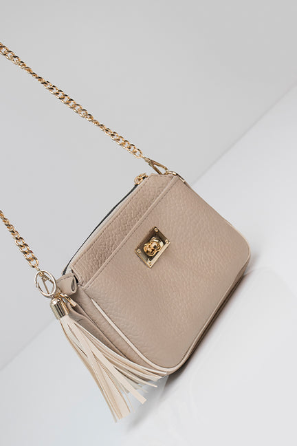 Uz torbu dolazi remen kombiniran s lancem te širi tekstilni remen, što pruža prilagođavanje različitim prilikama i stilovima nošenja. Dodatni privjesak u formi resica daje dozu razigranosti i ženstvenosti.